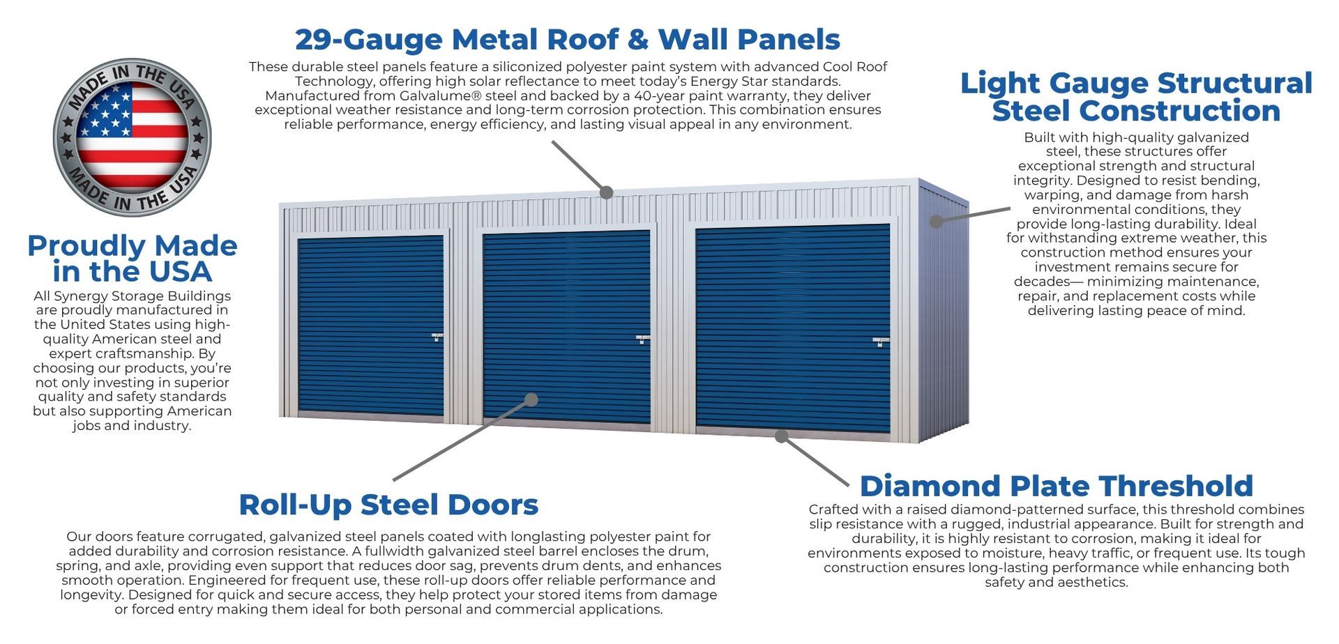 Built with galvanized steel frames, pressure-treated skids, and weather-resistant siding and roofing, Synergy sheds and garages are engineered to withstand heavy use and extreme climates for decades.